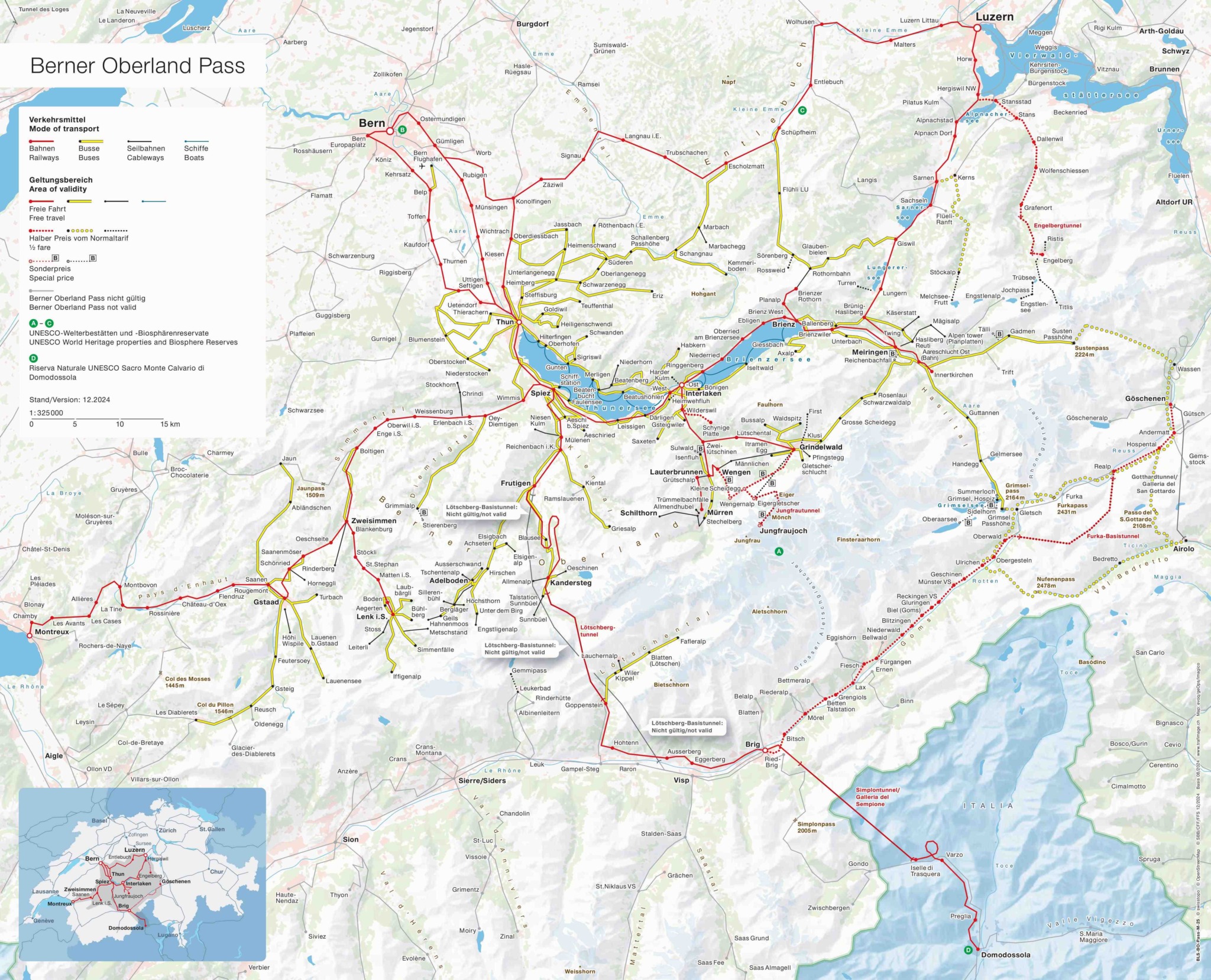 The Berner Oberland Pass covers all public transport travel by train, bus and boat, as well as more than 25 mountain railways across the Bernese Oberland. Fully covered mountains and other travel include but are not limited to: